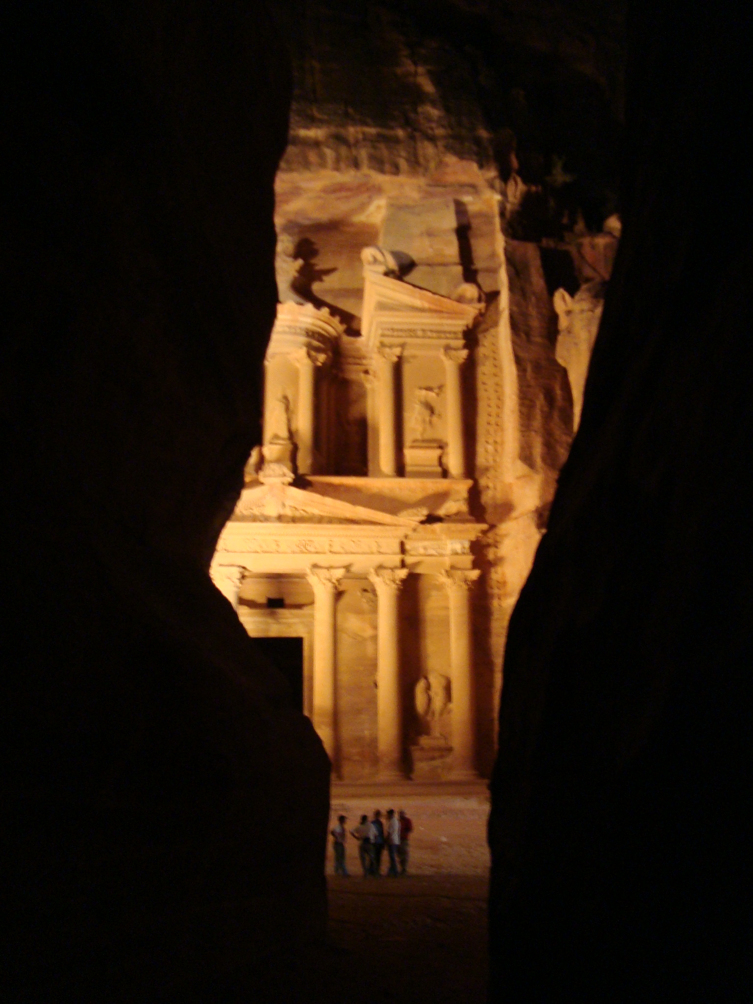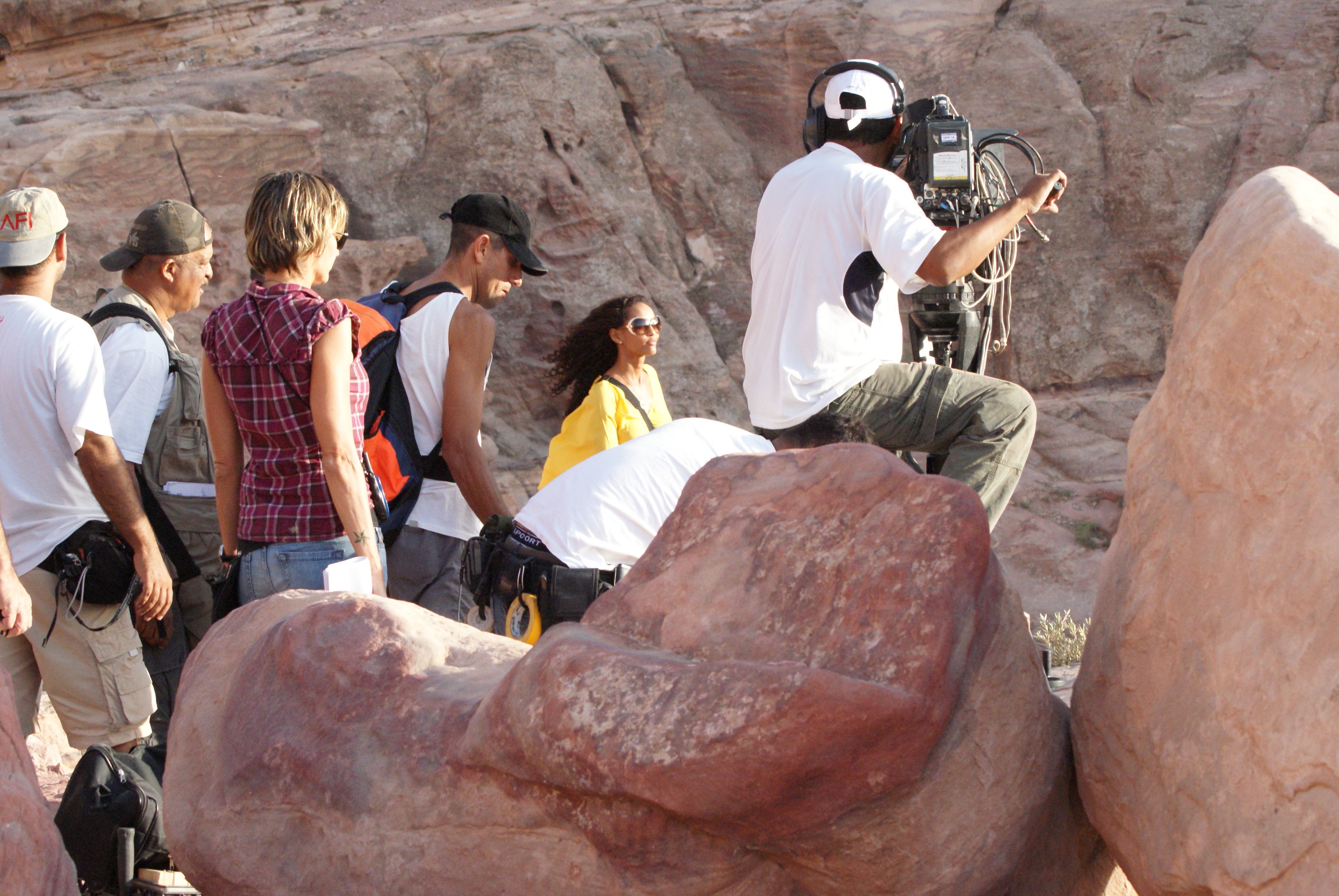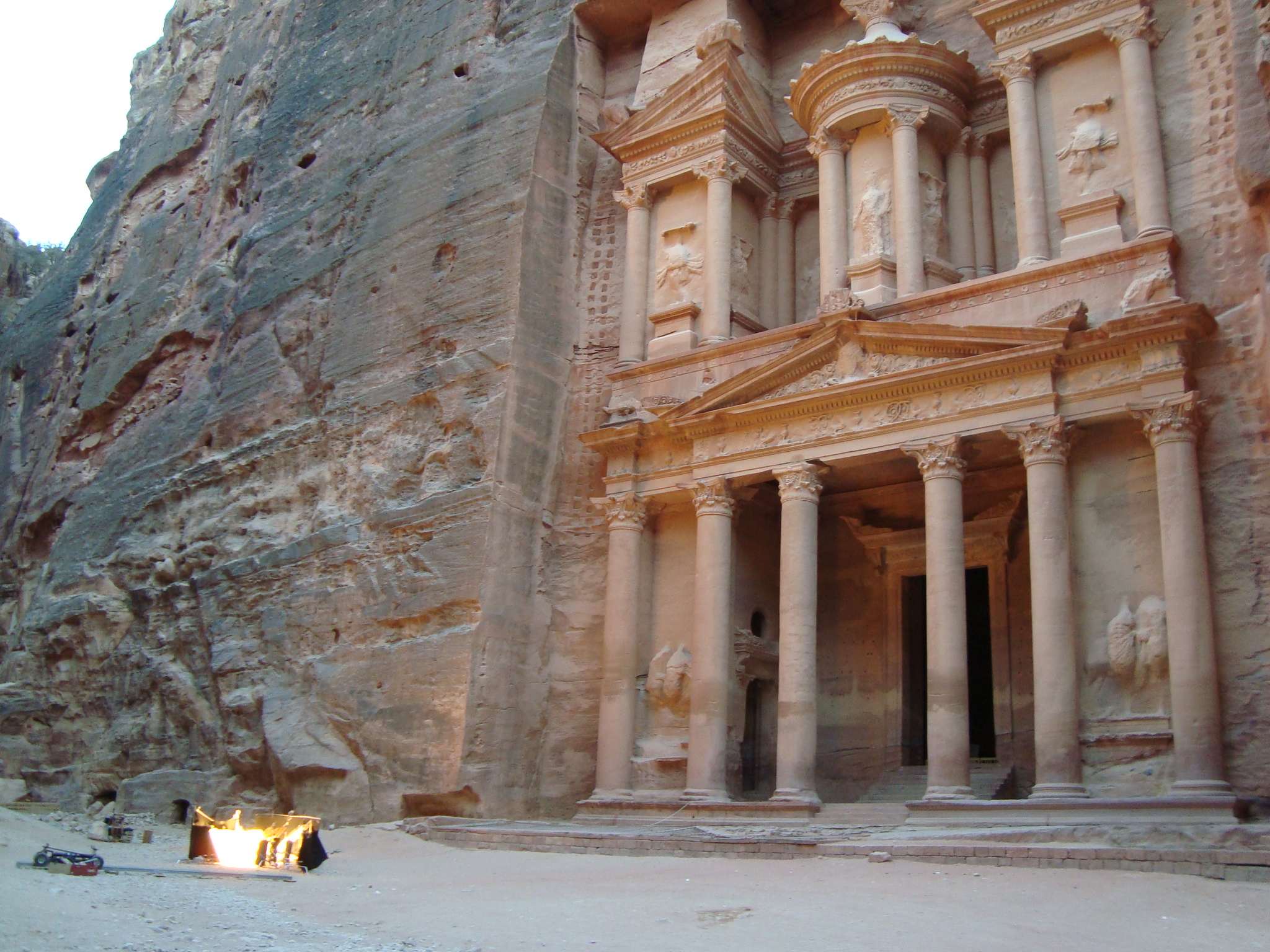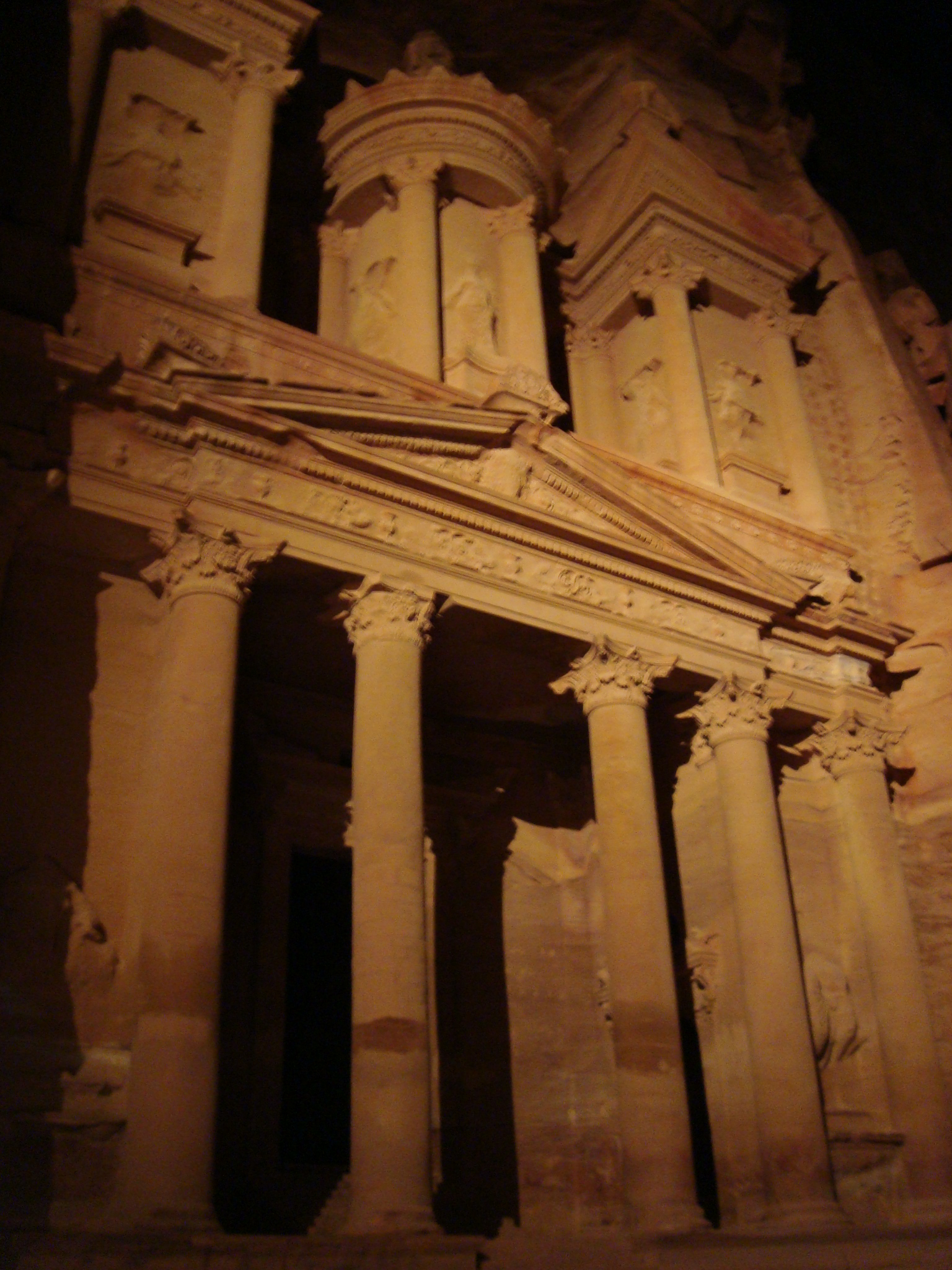 Quer mais desafio? Nunca na História, alguém tinha feito uma gravação noturna em Petra. Diurnas, várias (como Indiana Jones e Transformers). Mas, nós? Tínhamos no enredo da novela um desfile noturno acontecendo em frente à construção do Tesouro, principal ícone da cidade de 312 A.C.. Conseguimos autorização do Governo, com apenas uma restrição: pela manhã, na abertura do Parque aos turistas, o pátio deveria estar completamente livre de equipamentos e cenários. Poderíamos então iniciar a construção do circo (passarela, torres de iluminação, posicionamento de refletores, câmeras e gruas, maquiar elenco e figuração gigante) apenas após as 18h, gravar todas as cenas e desmontar o set sem deixar vestígios até as 05h da manhã seguinte. Como fazer isso tudo nessa pequena janela de tempo seria impossível, partimos para outro desafio: gravar cenas noturnas da fachada do Tesouro (ato sem precedentes em Petra) a serem usadas como fundo para cenas a serem gravadas no Brasil (também sem precedentes na Globo, nessas dimensões).